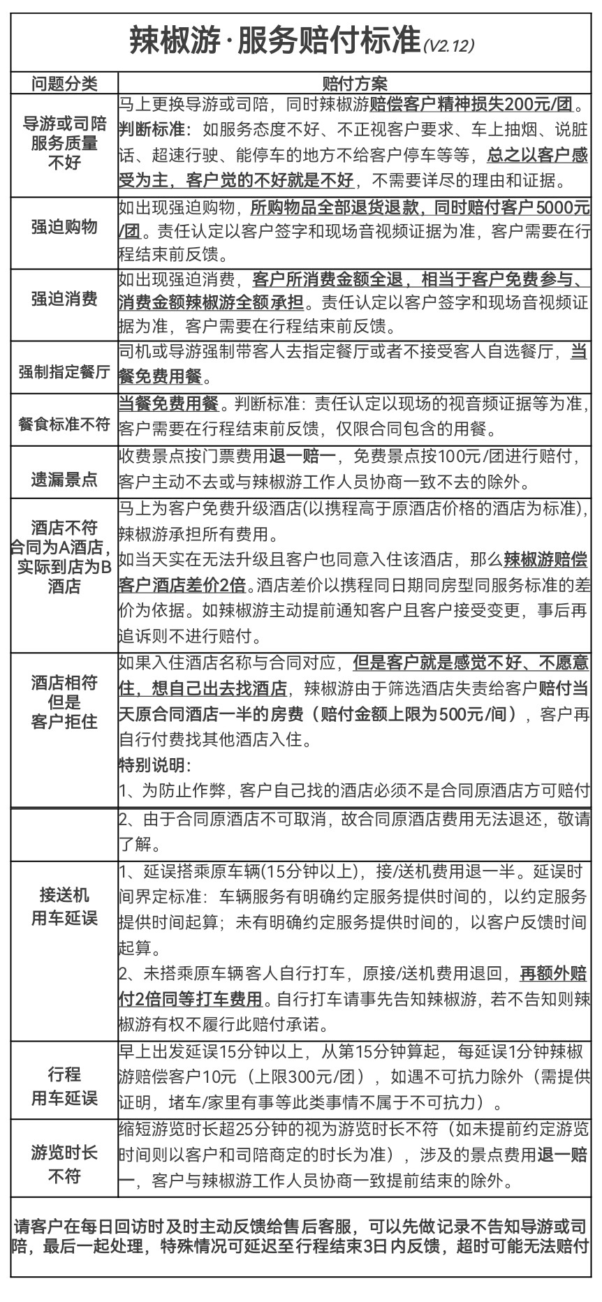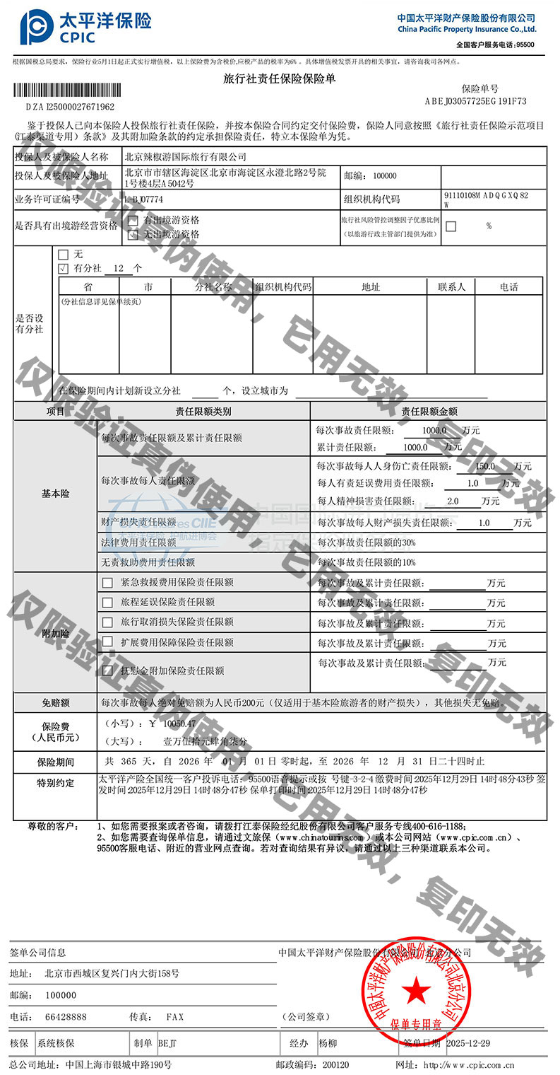 辣椒游已为游客购买1000万旅行社责任险,请放心报名!